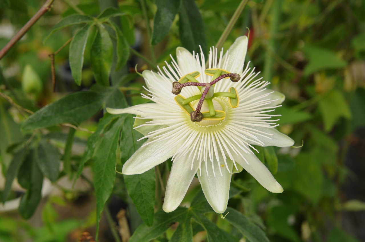 トケイソウ‘コンスタンス・エリオット’ 最終更新日:2017.10.11 Wednesday カエルレアの白花品種で、副花冠も白色となります。 科名トケイソウFamilyPassifloraceae学名Passiflora caerulea ‘Constance Eliott’耐寒性—15℃花径7—9℃