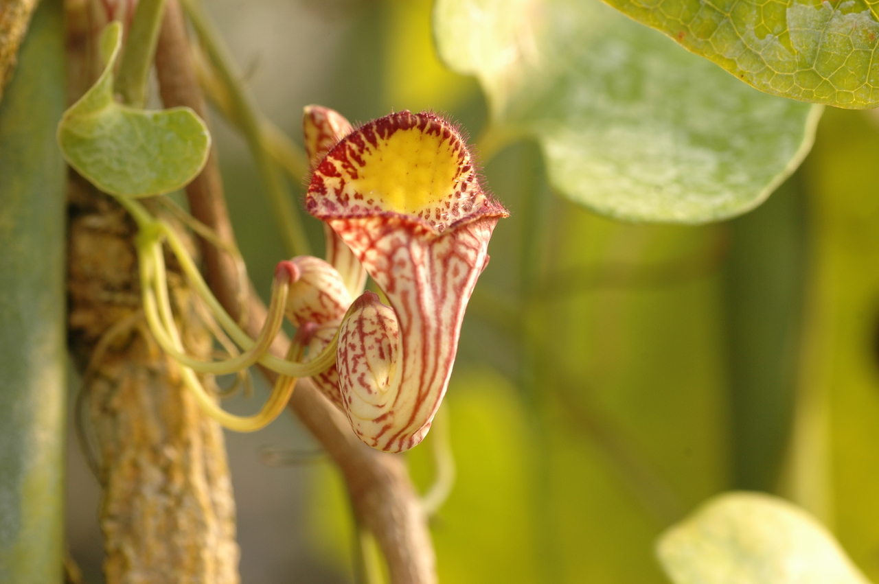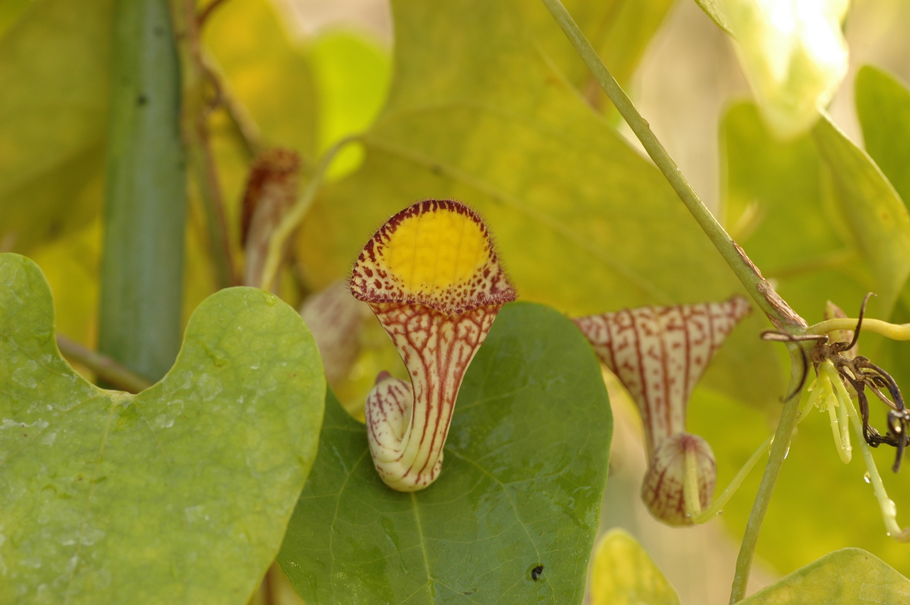 アリストロキア・トリアングラリス 最終更新日:2017.10.11 Wednesday ~3mとなる中形のつる性植物です。葉は革質で三角状のハート形です。花は漏斗形で、淡緑色地に茶褐色の斑点が入り、中央部には黄色の目があります。 科名ウマノスズクサFamilyAristolochiaceae学名Aristolochia triangularis花径3cm原産地ブラジル