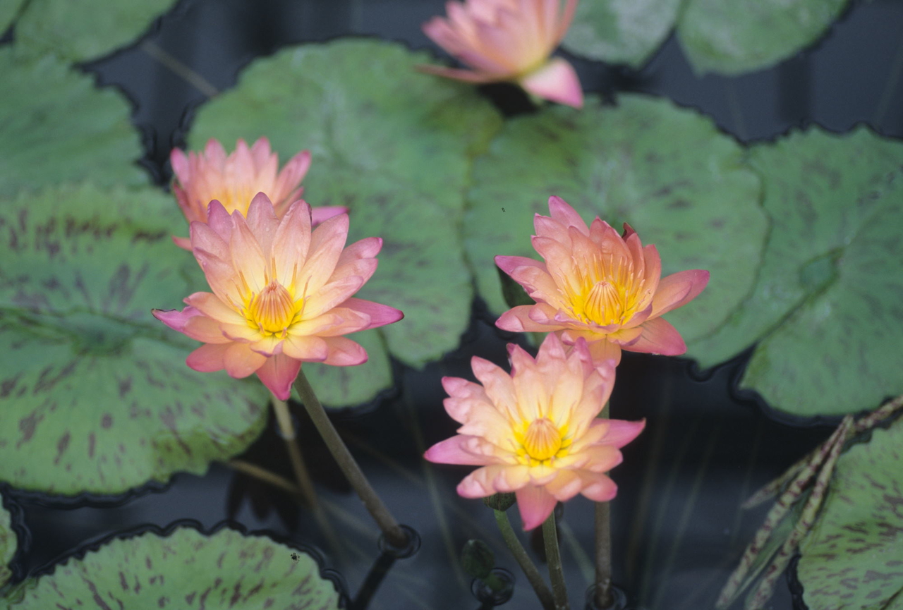 スイレン‘アルベルト・グリーンバーグ’ 最終更新日:2017.10.11 Wednesday 1969年作出(Monroe Birdsey)昼咲き種。実生選抜された品種です。サンセットカラーと呼ばれるオレンジピンク色の花は何とも言えない色合いで人気があります。葉には茶褐色の模様が入ります。 科名スイレンFamilyNymphaeaceae学名Nymphaea ‘Albert Greenberg’