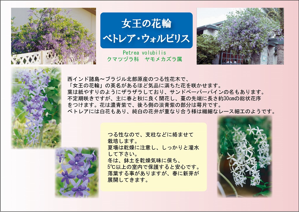 「女王の花輪~Queen's wreath~」、「紫の花輪~Purple wreath~」などと称されるように大変気品に満ちた花を咲かせます。
