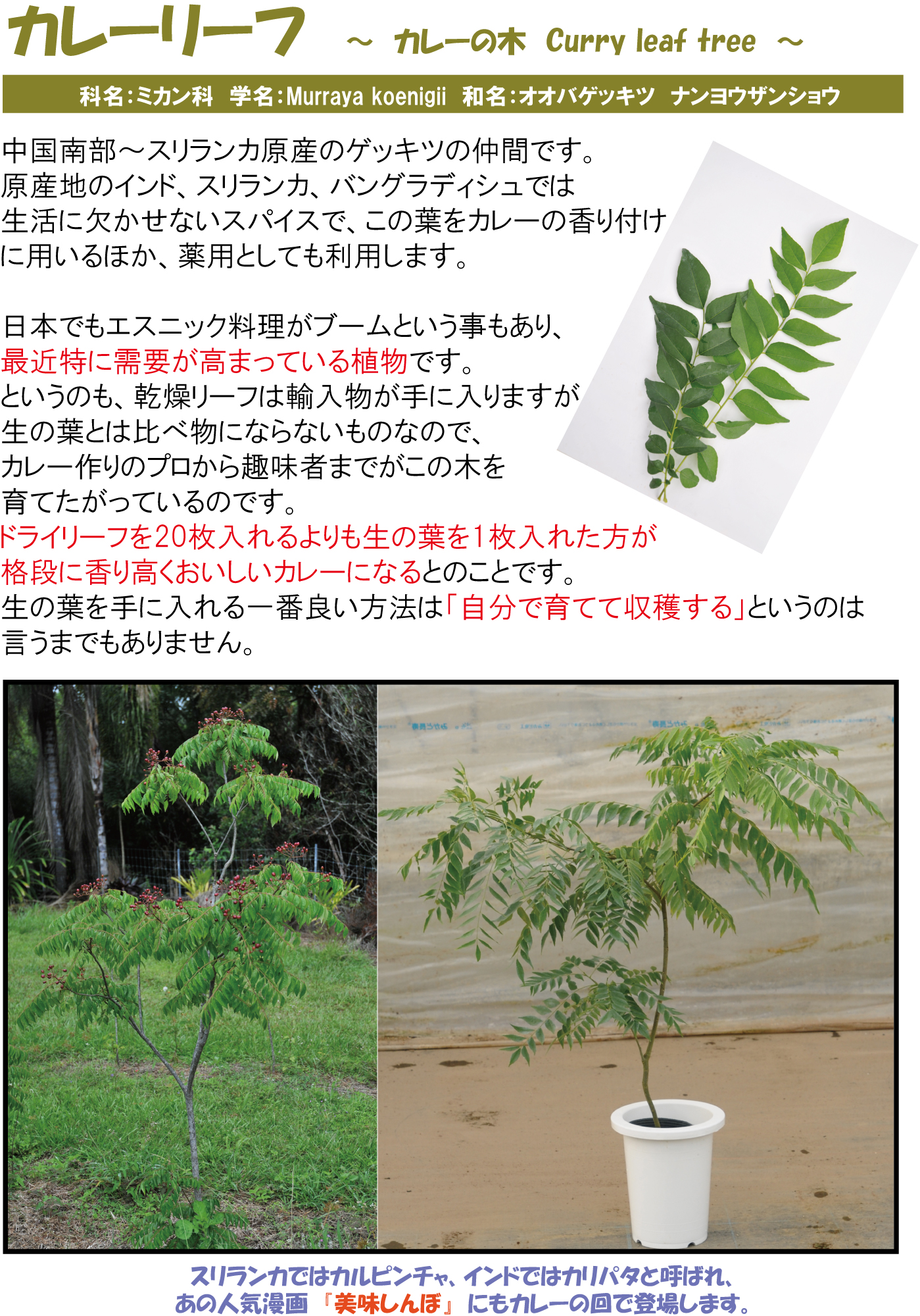 その名の通りカレーに欠かせないフレッシュスパイスで、おいしいカレーを作るには自らこの苗を育てて使用するのが一番の近道です。
